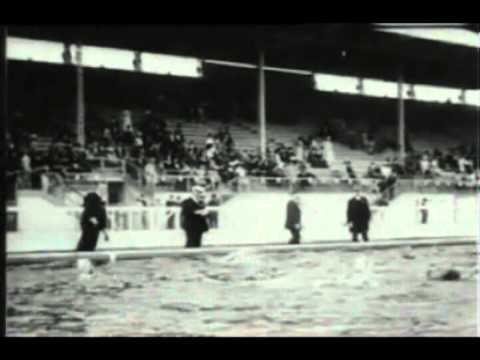 Water Polo competition at London 1908, Olympic Games. To note in the background of Water Polo field, scenes of the Cycling competition held in the White City Stadium.